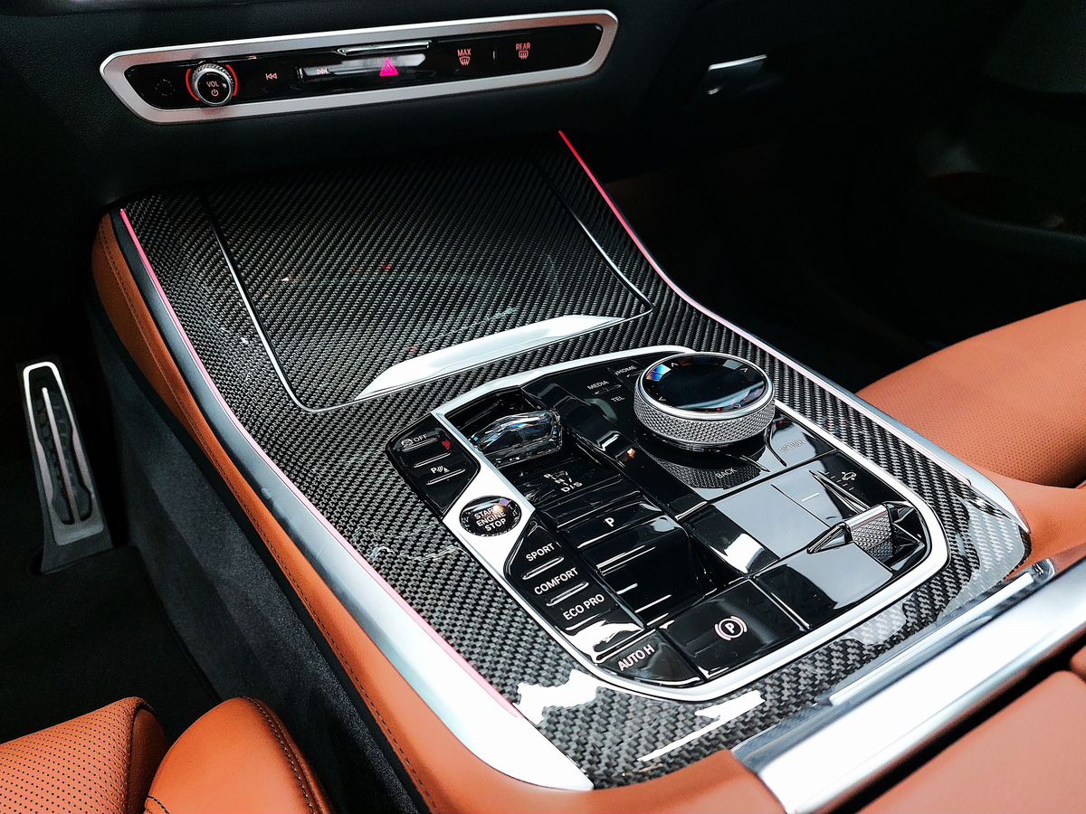 Стеклянная отделка деталей интерьера CraftedClarity: переключатель переключения передач с подсветкой символа "X", регулятор громкости, контроллер iDrive, кнопка Start/Stop